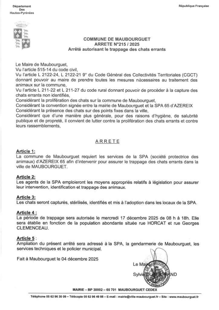 Les chats errants non identifiés et sans propriétaire, vivant dans des lieux publics, seront récupérés et pris en charge par la SPA65.