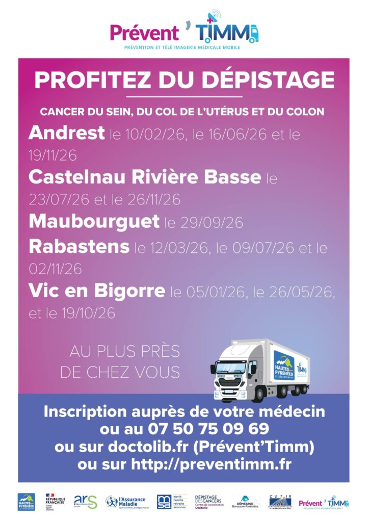 Nous avons le plaisir de vous informer que le camion Prévent’TIMM poursuit sa mission de dépistage itinérant des cancers dans les Hautes-Pyrénées.