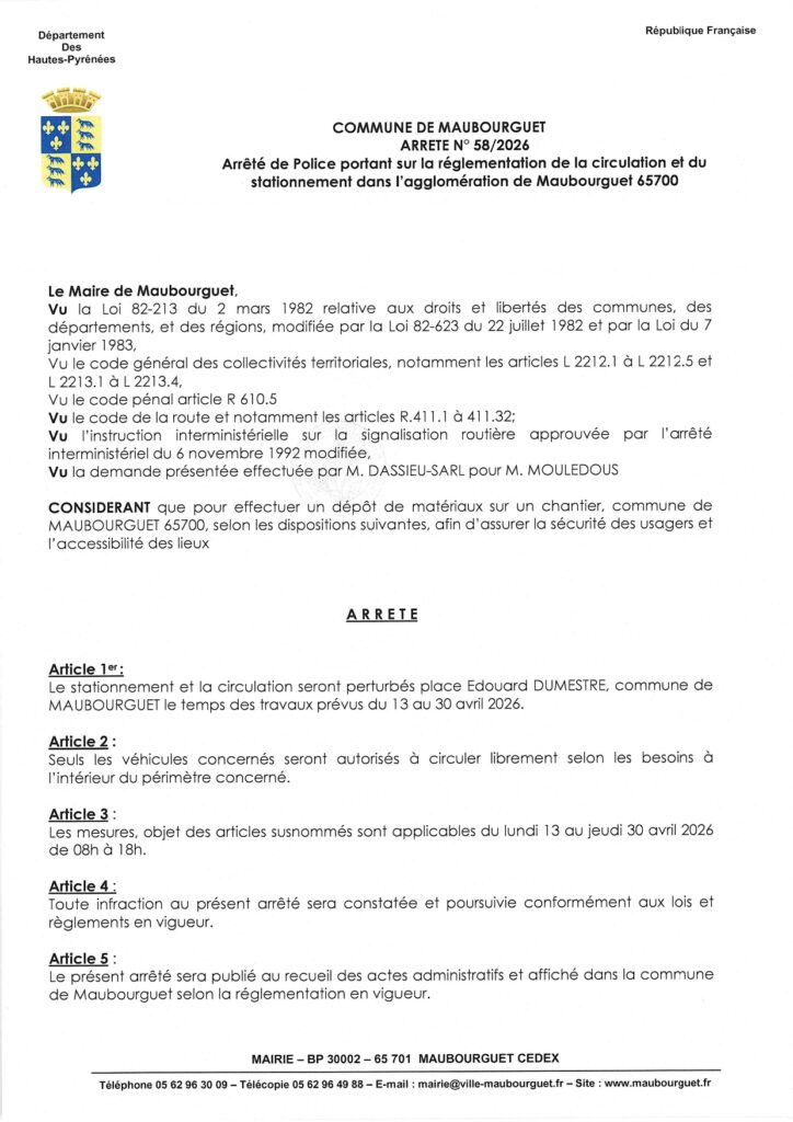 Circulation et stationnement perturbés place Edouard Dumestre du 13 au 30 avril 2026 pour travaux.